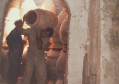 La técnica de fabricación de las tinajas se realizaba mediante el sistema de churros o rollos de barro, superpuestos manualmente hasta alcanzar grandes dimensiones. Este proceso exigía una enorme destreza técnica, un profundo conocimiento del material y una experiencia adquirida a lo largo de años de práctica. Cada fase —desde la extracción y preparación de la arcilla, el levantado de la pieza, el secado controlado o la cocción en hornos de gran tamaño— implicaba riesgos, esfuerzo físico y un saber hacer transmitido de generación en generación.